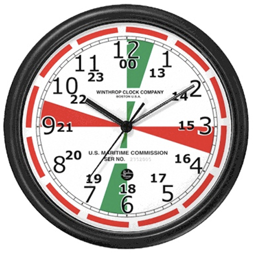 L’horloge doit être réglée en heure UTC. Les secteurs durent 3 minutes. Les secteurs rouges indiquent une veille et un silence dans la gamme 2173–2190 kHz (Radio MF). Les secteurs verts indiquent, eux, une veille et un silence dans la gamme 500 kHz (télégraphe).