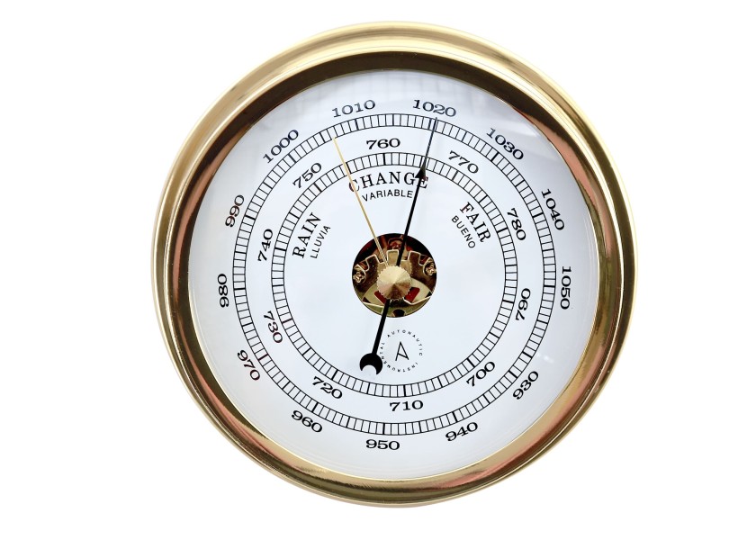 Le Baromètre indique la pression atmosphérique. Dans le système météorologique, des fronts chauds et froids se rencontrent créant des zones où la pression varie. On mesure cette pression soit en hectopascals (hPa), désormais le plus courant ; soit en millimètre de mercure (mmHg). Il est convenu que la valeur d’une pression nulle sur terre est de 1013 hPa (ou 760 mmHg). Si à un endroit donné, la pression est plus faible que cette valeur, on dira qu’il s’agit d’une zone dépressionnaire, si la pression est supérieure on sera alors dans une zone anticylonique. La pression varie entre 940 et 1050 hpa. Il est possible de consulter via Meteofrance le mouvement des dépressions et anticyclones.