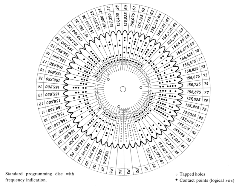 La sélection des canaux se faisait en tournant un disque. Chaque position permettait de mettre en contact les « points noirs » conducteurs avec des lames de contact. Les différentes combinaisons donnaient alors la bonne fréquence. Il était même possible de configurer sur mesure 5 canaux réservés sur la fréquence de son choix et d’atteindre ainsi les fréquences comprises entre 157Mhz et 163 Mhz ou d’activer automatiquement la réduction à 1W. On retrouve le manuel d’utilisation disponible en ligne