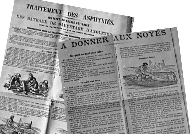 Les techniques de réanimation des noyés étaient des plus barbares sans réelle efficacité. On mettait par exemple la victime à plat ventre sur une barrique, pour la secouer par divers mouvements. Un autre usage était de pendre le noyé par les pieds au-dessus d’un feu pour le vider de son eau, la chaleur du feu devait évaporer l’eau avalée et l’inhalation de fumée devait le faire réagir. On pouvait aussi placer le noyé à l’intérieur d’un tonneau, que l’on roulait dans un sens puis dans l’autre pour vider l’estomac. Enfin les Hollandais créèrent les pompes fumigatoires, l’apothicaire Philippe Pla perfectionna ces boîtes en prévoyant le matériel nécessaire à injecter de la fumée de tabac par voie rectale.